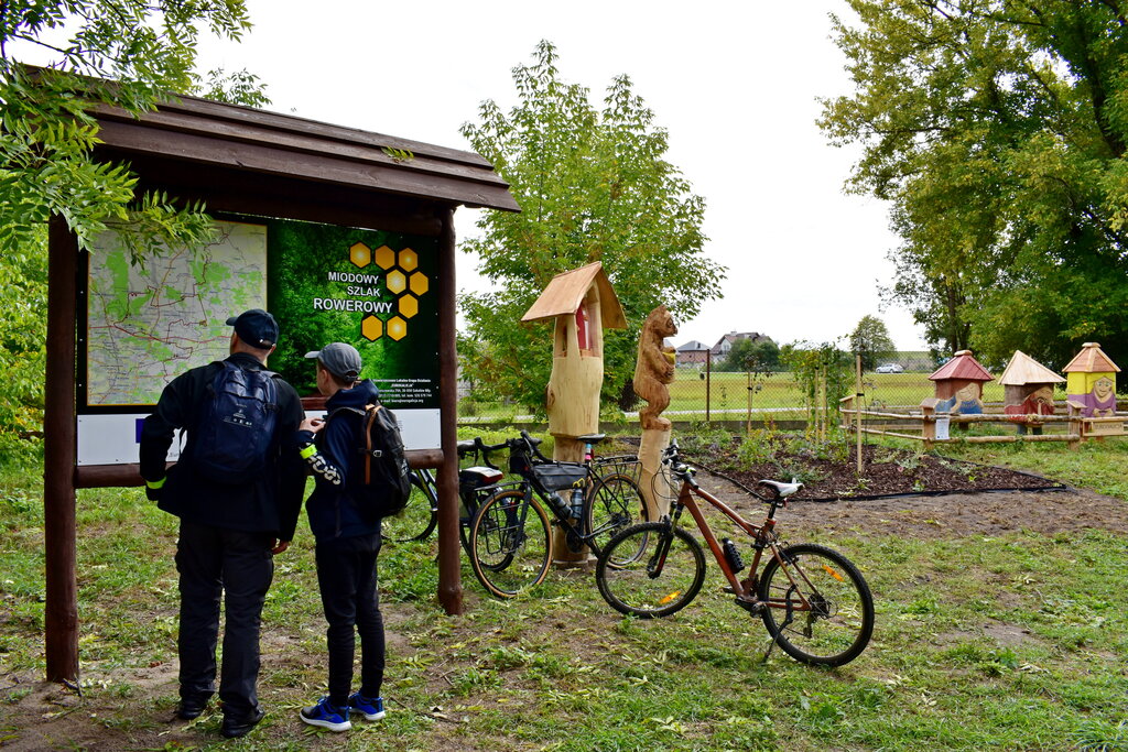 Na Miodowym Szlaku Rowerowym powstało 8 punktów postojowych składających się z: wiaty, ławostołów, stojaka na rowery, grilla, kosza na śmieci, tablicy informacyjnej oraz dwóch drewnianych rzeźb. W ramach projektu utworzono także 5 ogrodzonych pasiek pokazowych składających się z 15 uli. Jedna pasieka zawiera 3 drewniane, rzeźbione ule (w tym jeden z zakładaną przeźroczystą ścianką do obserwacji pszczół). Zarówno rzeźby jak i ule swoim wyglądem nawiązują do pszczelarstwa, lokalnych tradycji oraz ekologii. Aby zapewnić bezpieczeństwo pszczołom w 5 miejscach zamontowany został monitoring.