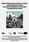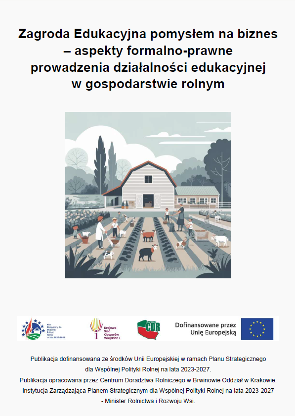 Rozwój działalności edukacyjnej w gospodarstwach rolnych wymaga nie tylko dobrego pomysłu, ale także znajomości przepisów prawa, zasad rozliczeń oraz obowiązków organizacyjnych. Publikacja „Zagroda Edukacyjna pomysłem na biznes – aspekty formalno-prawne prowadzenia działalności edukacyjnej w gospodarstwie rolnym” stanowi kompleksowe opracowanie obejmujące zagadnienia tematyczne pomocne przy rozpoczynaniu i prowadzeniu działalności edukacyjnej w gospodarstwie rolnym.