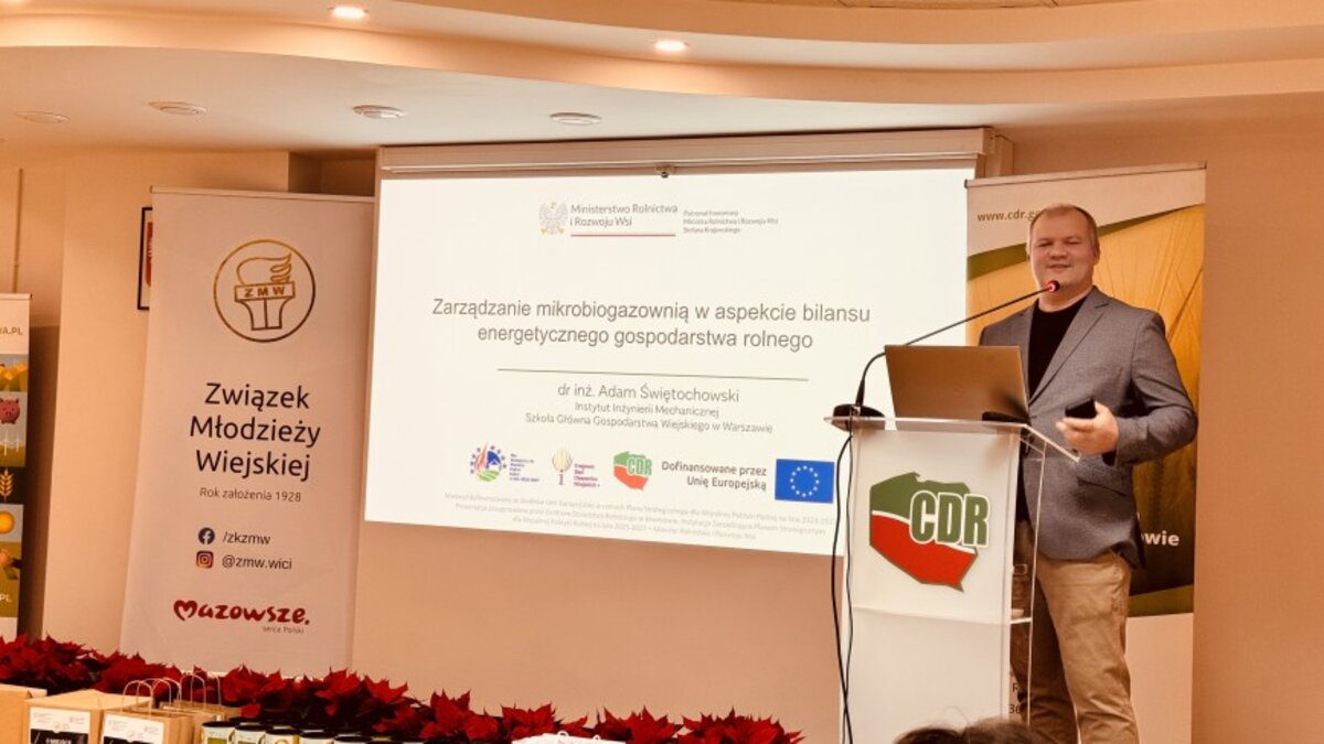 Drugi dzień konferencji rozpoczął się dwoma wykładami dr. inż. Adama Świętochowskiego z SGGW w Warszawie. W pierwszym omówił on surowce, proces technologiczny oraz zagadnienia związane z masą pofermentacyjną w biogazowniach. Zwrócił uwagę, że na prawidłowy przebieg procesów fermentacyjnych wpływają m.in. temperatura, odczyn pH oraz częstotliwość mieszania substratów. Drugi wykład poświęcono zagadnieniom dotyczącym zarządzania mikrobiogazownią. Szczegółowo omówiono procesy zachodzące w instalacji oraz funkcje poszczególnych urządzeń. Oba wystąpienia oparte były na praktycznych przykładach z biogazowni Centrum Edukacji Ekologicznej w RZD Wilanów-Obory. Ostatni wykład wygłosił Marek Bielewski z CDR Oddział w Radomiu, prezentując instalacje OZE funkcjonujące w ośrodku. Wśród nich znajdują się m.in. 133 panele fotowoltaiczne, pompa ciepła oraz sześć kolektorów słonecznych wykorzystywanych do ogrzewania wody użytkowej i wytwarzania energii elektrycznej, co w znacznym stopniu obniża koszty zużycia prądu. Konferencję zakończyło wystąpienie dr. Henryka Skórnickiego, który przedstawił ofertę współpracy CDR z nauczycielami szkół rolniczych oraz bogatą ofertę edukacyjną skierowaną do młodzieży.