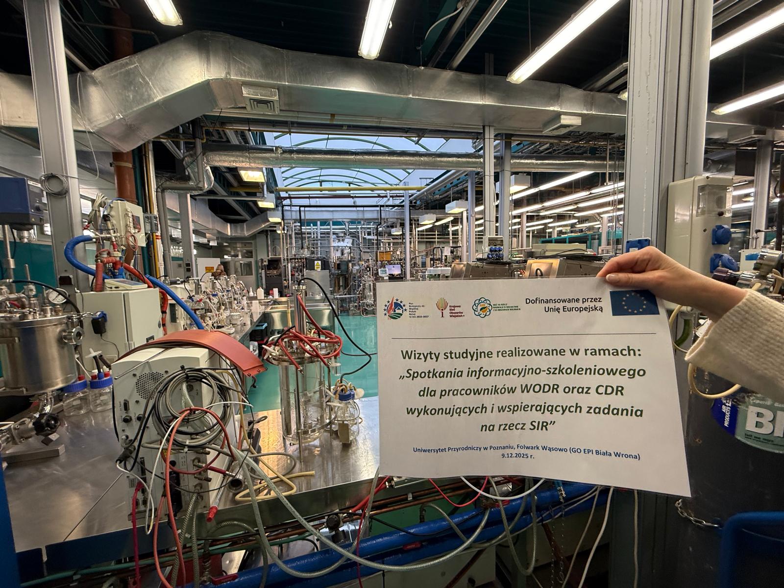Centralnym punktem wizyty była sama Hala Półtechniki, gdzie znajdują się bioreaktory w skali pilotażowej – od laboratoryjnych, przez setki, aż do 1000 litrów. Laboratorium to wchodzi do gry w momencie, gdy wyniki z małej skali muszą zostać zwalidowane w warunkach odzwierciedlających realia przemysłowe. Taka walidacja w skali 1000 litrów daje dowód na to, że proces zachowa efektywność po przeniesieniu na skalę przemysłową. Jednostka ta realizuje prace przedwdrożeniowe i usługi, np. produkcję enzymów do testów na Covid-19, co miało miejsce w czasie pandemii. Podkreślono, że w tej skali sterylność jest ogromnym wyzwaniem, a błąd konstrukcyjny bioreaktora może zepsuć cały proces.